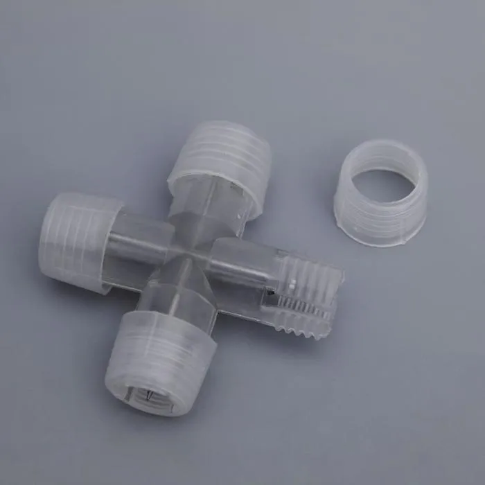 Коннектор Х-образный для дюралайта, 13 мм, 2W служит для соединения светодиодного дюралайта или гибкого неона при необходимости удлинения шнура, а также для организации места стыка в углах или создания примыканий и перекрестий.