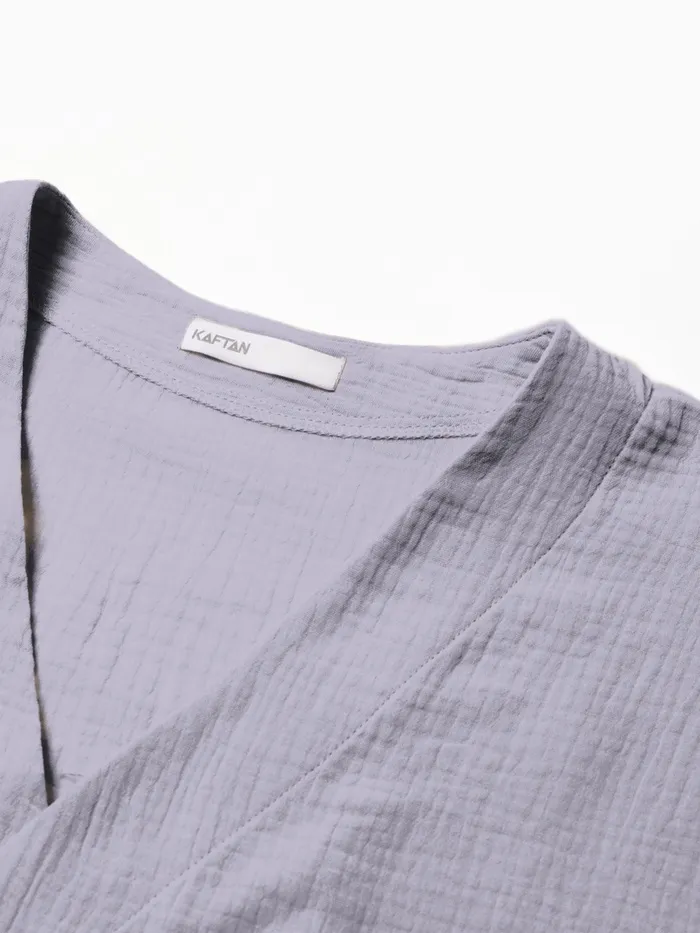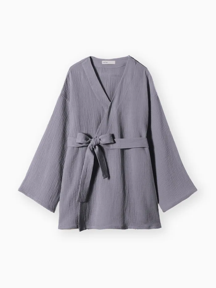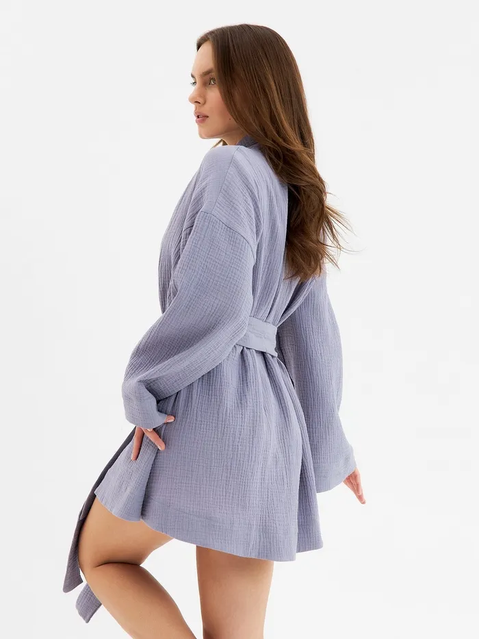 Короткий женский домашний халат в сером цвете станет идеальным выбором для уюта и комфорта. Выполненный из 100% хлопка, он мягко окутывает кожу, создавая ощущение тепла и уюта.