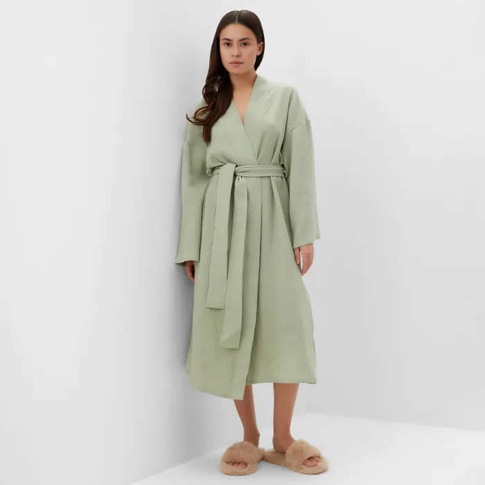 Женский домашний халат из коллекции KAFTAN Basic в нежно-зелёном цвете — это стильное и удобное решение для повседневного использования. Халат из муслина дарит комфорт и лёгкость. Прямой покрой и длинные рукава делают его универсальным, подчеркивая фигуру.