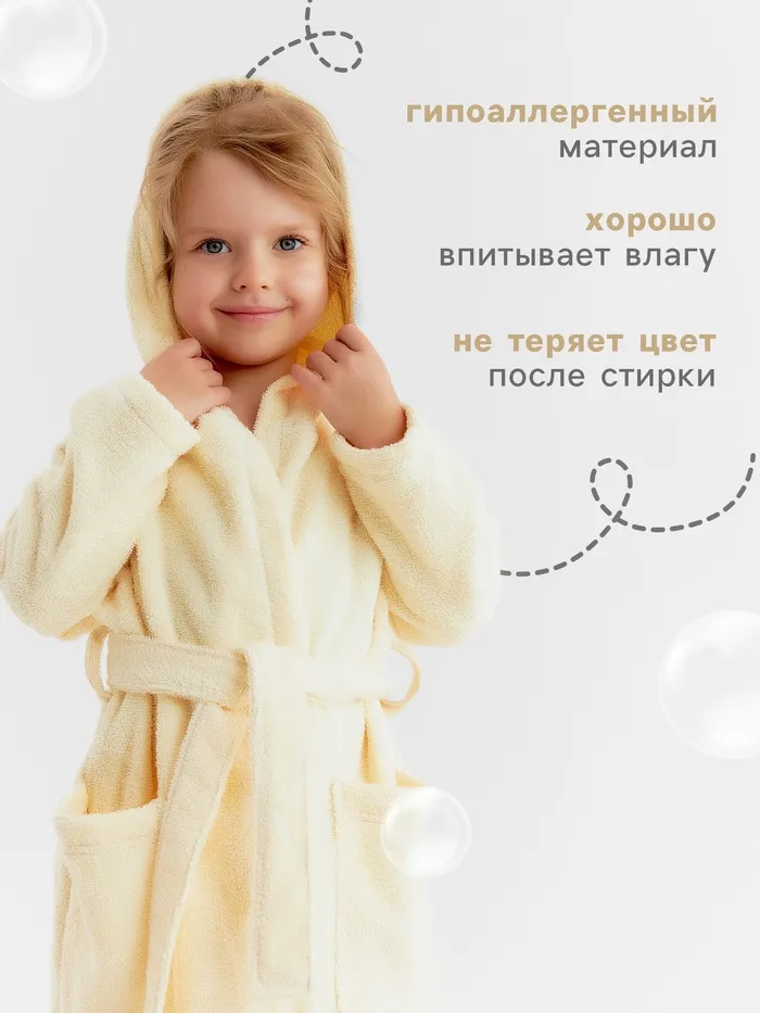 Халат легко стирается, быстро сохнет и сохраняет свою форму. Его можно использовать после купания, на пляже или дома, создавая уют и комфорт для вашего ребёнка.