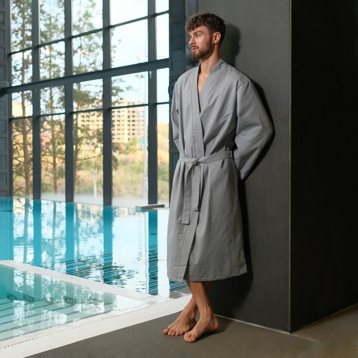 Халат вафельный мужской удлинённый Экономь и Я размер 54-56, цвет серый, 100% хлопок, 200г/м2