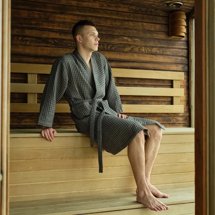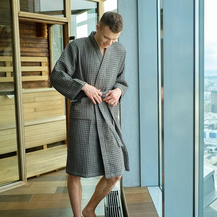 Халат вафельный мужской Экономь и Я рукав 3/4, размер 54-56, серый, 100% хлопок, 200г/м2
