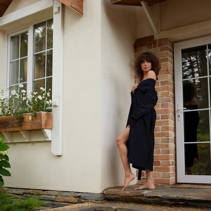 Халат вафельный женский удлинённый Экономь и Я размер 46-48, цвет черный, 100% хлопок, 200г/м2 — Характеристики