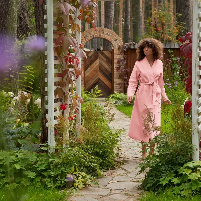 Халат вафельный женский удлинённый Экономь и Я размер 46-48, цвет пудра, 100% хлопок, 200г/м2 — Характеристики