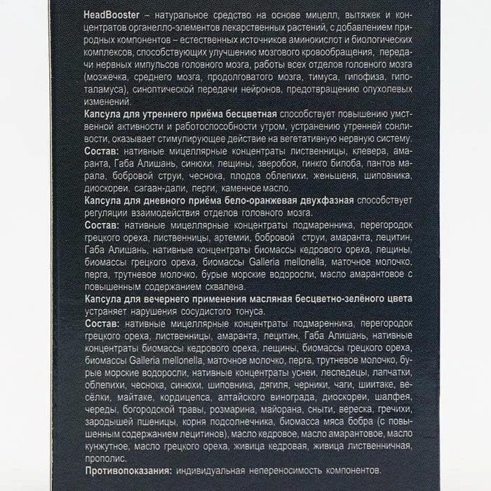 Состав: капсулы для утреннего приёма (бесцветные): нативные мицеллярные концентраты лиственницы, клевера, амаранта, Габа Алишань, синюхи, лещины, зверобоя, гинкго билоба, пантов марала, бобровой струи, чеснока, плодов облепихи, женьшеня, шиповника, диоскореи, сагаан-дали, перги, каменное масло.