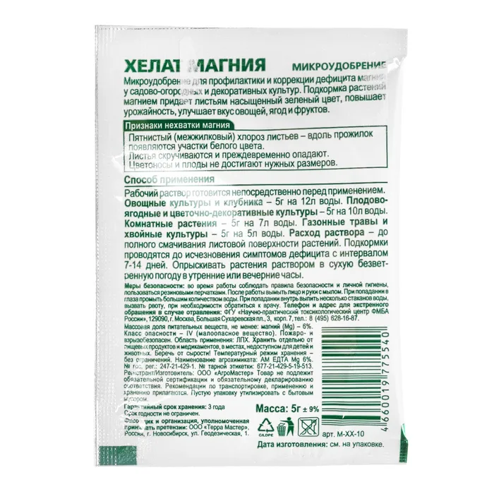 Восполняет дефицит магния, служит для профилактики и лечения пятнистости и скручивания листьев.