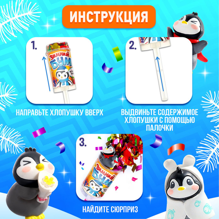 - В каждой хлопушке спрятана маленькая сюрприз-игрушка в виде пингвина. Это может стать отличным дополнением к любой коллекции игрушек или приятным сюрпризом для ребенка