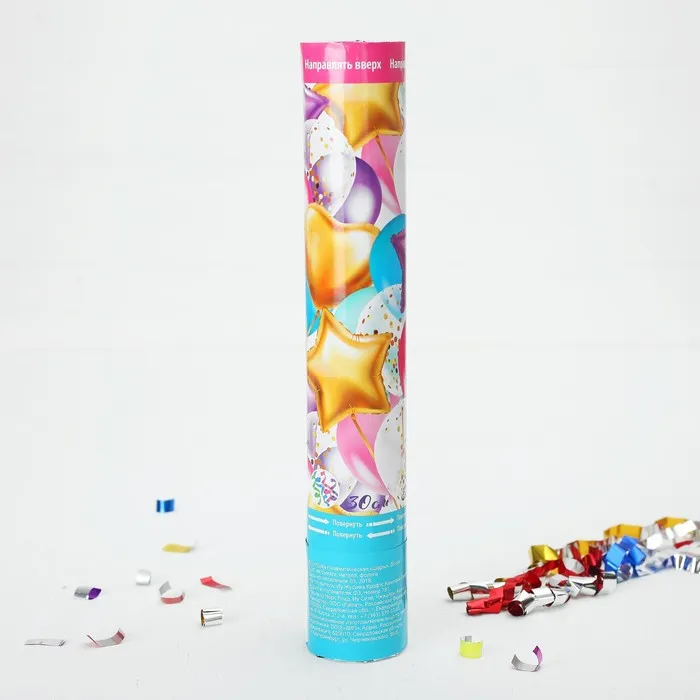 Как оригинально завершить поздравление, придать подарку по-настоящему взрывной характер? Решение есть: пневмохлопушка к вашим услугам. Она будет стрелять! Но не пугайтесь — серпантином, конфетти и фольгой. Приводится в действие поворотом специально обозначенной части за счёт сжатого воздуха.