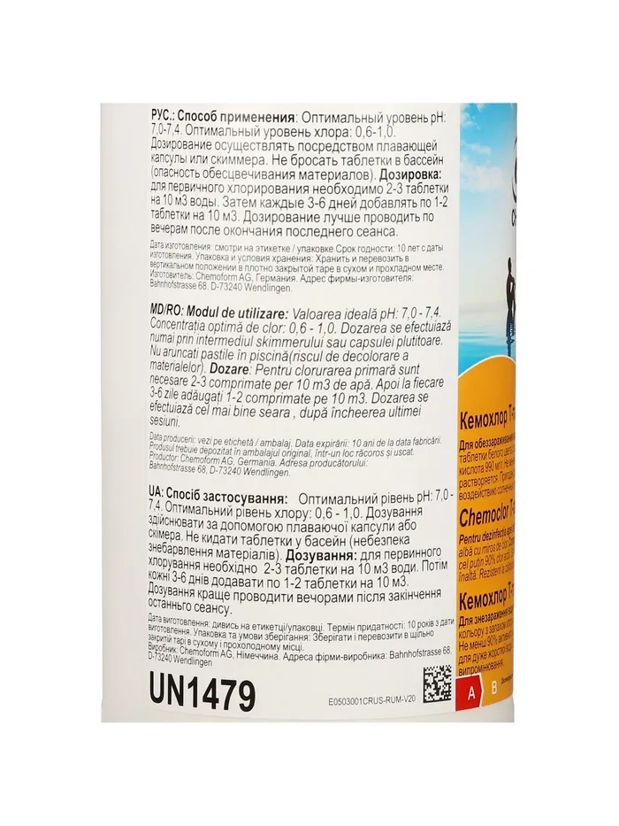Меры предосторожности: соблюдайте меры по безопасности, указанные на этикетке продукта и в паспорте безопасности. Продукт хранить в оригинальной упаковке в прохладном и защищённом от солнца месте. Продукт хранить и перевозить стоя! Внимание: Не смешивать с другими химикатами! При смеси с другими хлорными продуктами опасность выделения ядовитых газов и взрыва!
