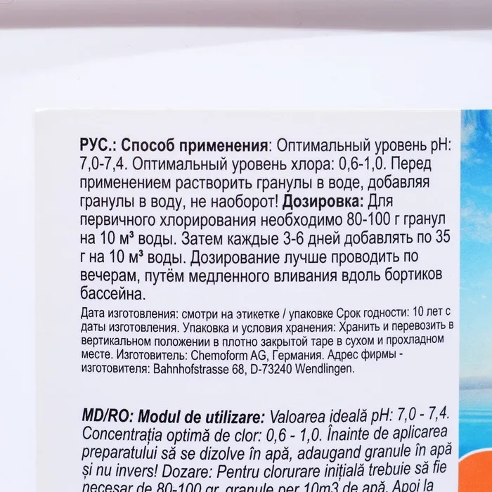Приготовленный с применением трихлоризоциануровой кислоты хлорный препарат предназначен для ударного хлорирования и дезинфекции воды в бассейнах любого типа. Также содержит более 50 % активного хлора в своём составе.