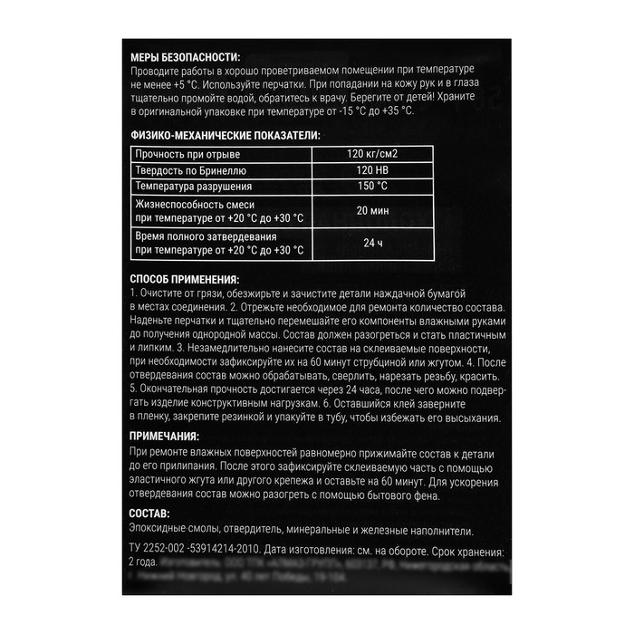 Холодная сварка Grand Caratt, универсальная, водостойкая, 58 г — Характеристики
