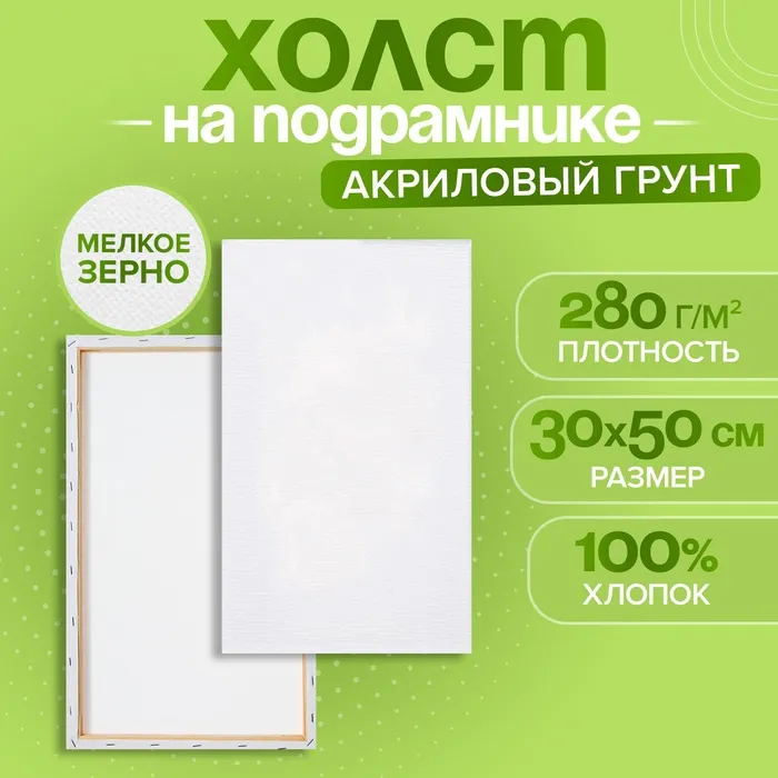 Холст на подрамнике, хлопок 100%, 1.6×30×50 см, акриловый грунт, мелкозернистый, 280 г/м² — Характеристики