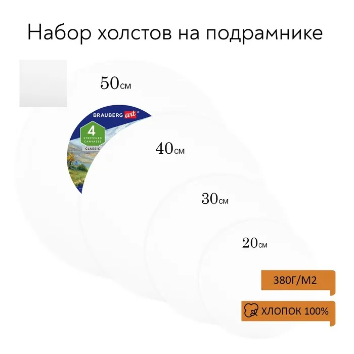 Холсты на подрамнике 4 шт., круглые 20, 30, 40, 50 см, грунтованные, 380 г/м2, 100% хлопок, BRAUBERG — Характеристики