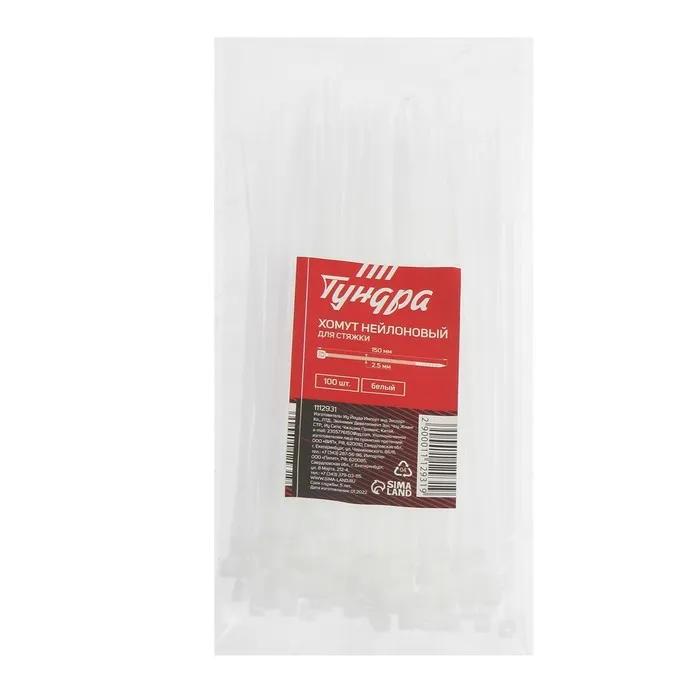 Хомут нейлоновый для стяжки, ТУНДРА, 2.5×150 мм, белый, 100 шт. — Характеристики