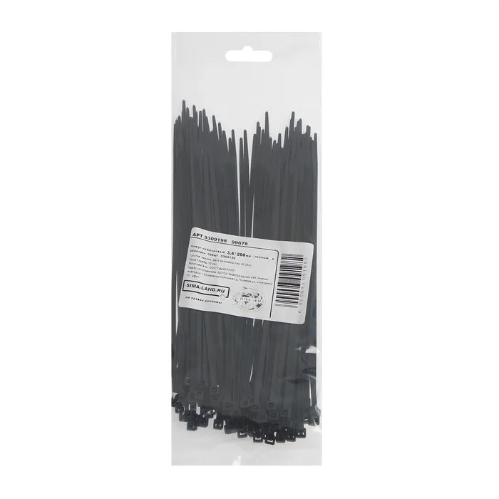 Хомут нейлоновый, пластик, 3,6х200 мм, черные, в упаковке 100 шт. — Характеристики