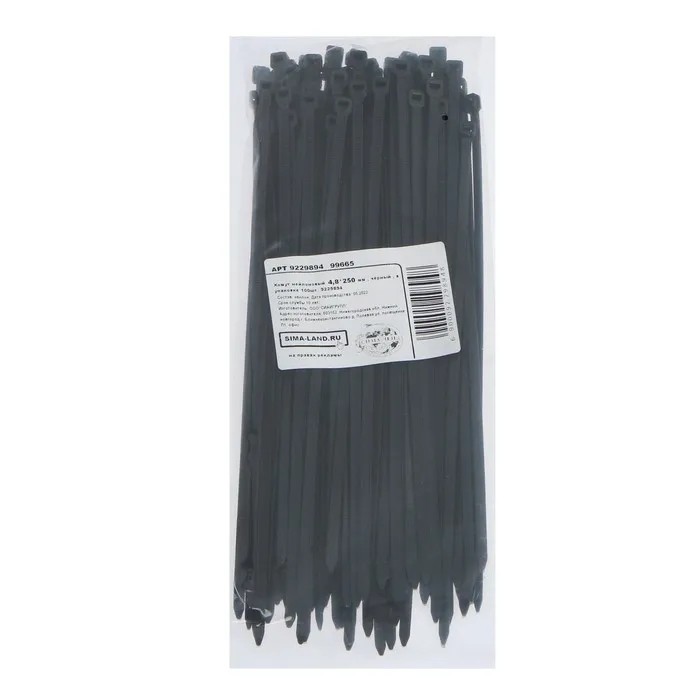 Хомут нейлоновый, пластик, 4.8×250 мм, черный, в упаковке 100 шт. — Характеристики