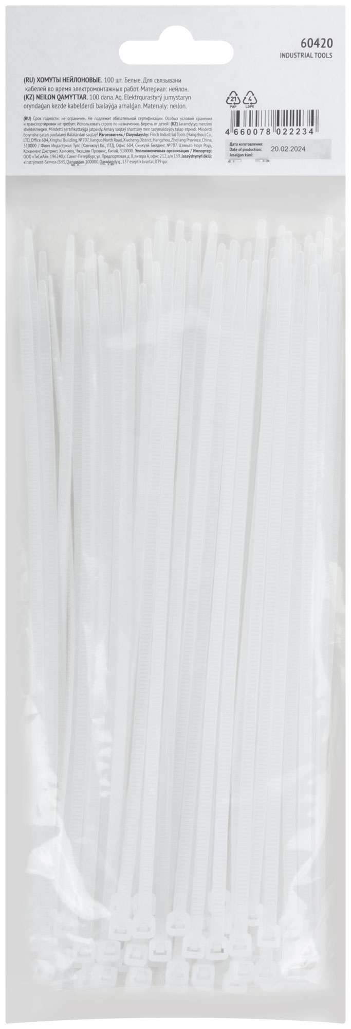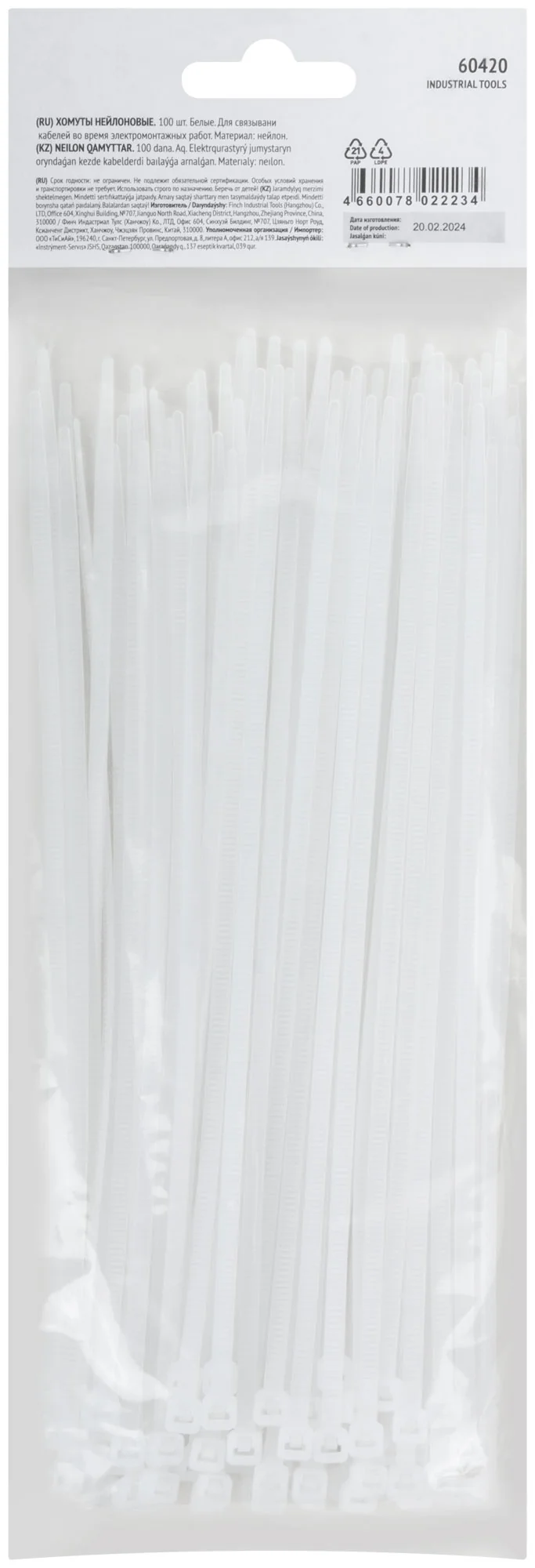 Хомуты нейлоновые 200x3,6 мм белые для надежной фиксации проводов