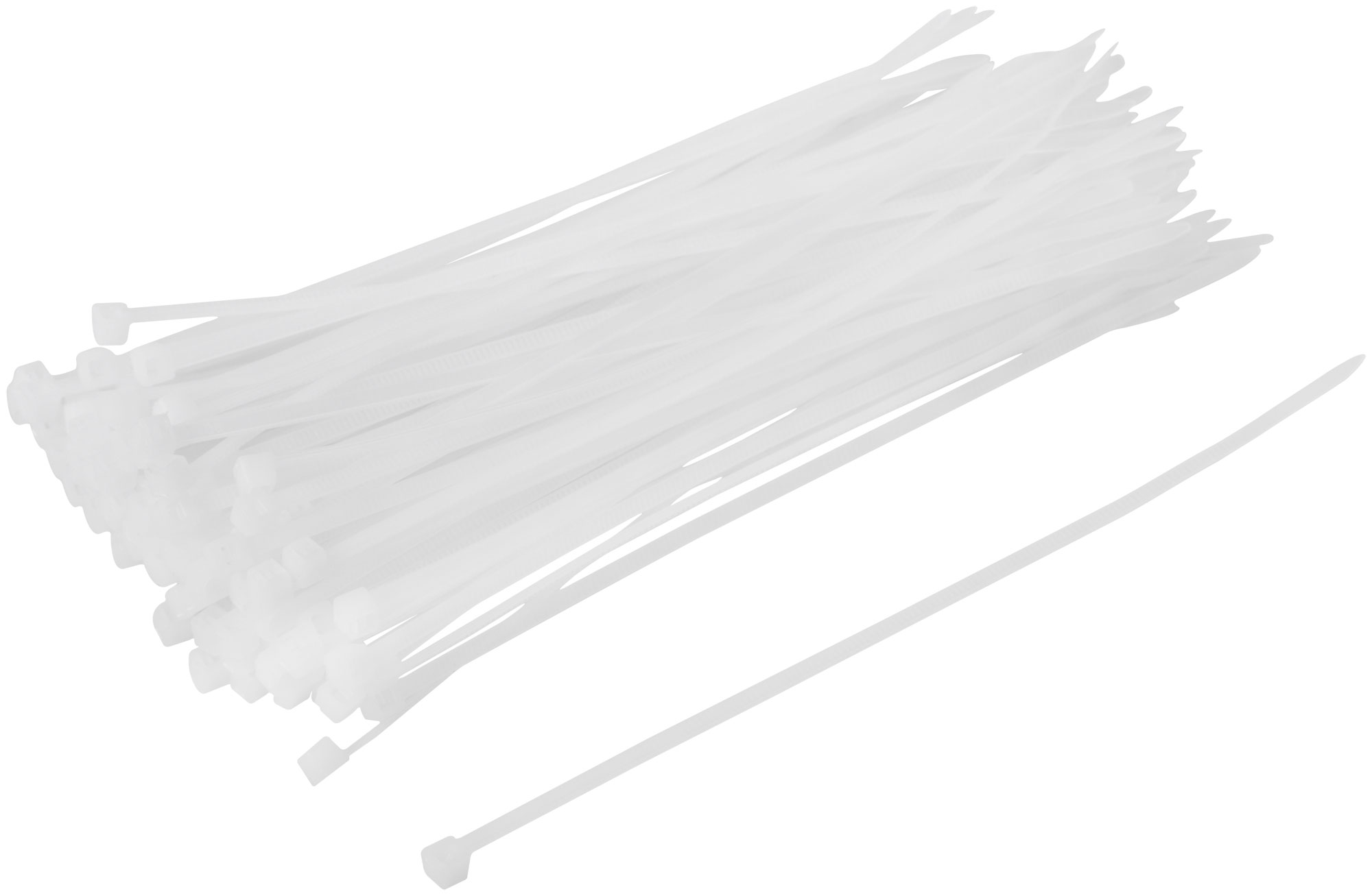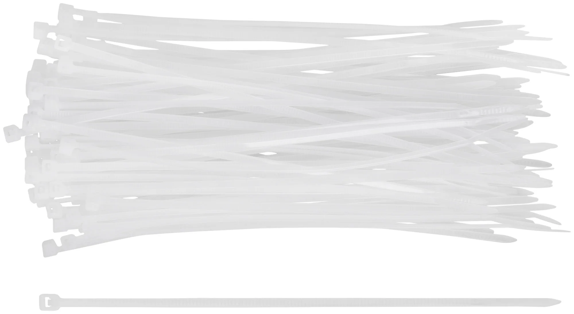 Изготовленные из прочного нейлона, хомуты обладают ступенчатой фиксацией с блокировкой обратного хода, что делает их удобными и безопасными в использовании. Упаковка содержит 100 штук, что идеально подходит для работы с большими объёмами материала.