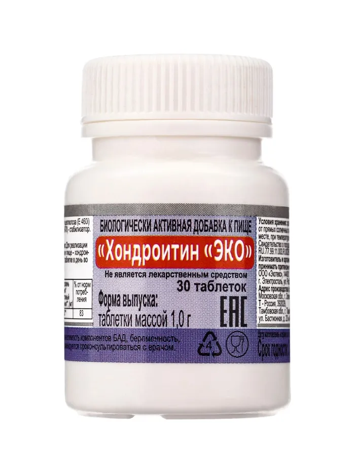 Хондроитин «ЭКО», №30, 1000 мг — эффективная поддержка здоровья суставов и хрящевой ткани. Хондроитин помогает сохранять эластичность суставов, способствует восстановлению хрящей и уменьшает дискомфорт при физических нагрузках или возрастных изменениях.