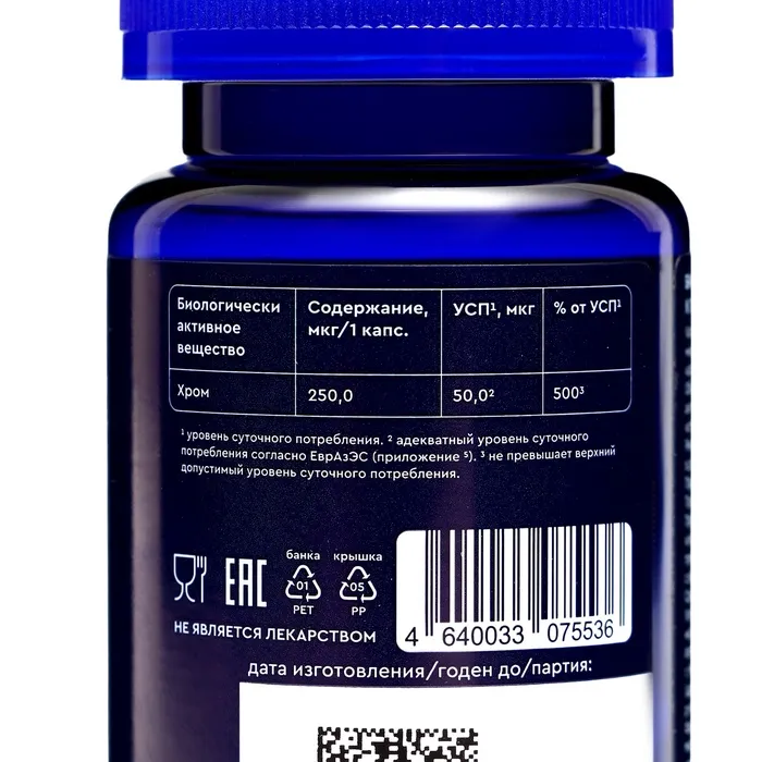 Перед началом приема добавок, содержащих хром, рекомендуется проконсультироваться с врачом, особенно если у вас есть хронические заболевания или вы принимаете другие лекарства. Не превышайте рекомендуемую дозу.
