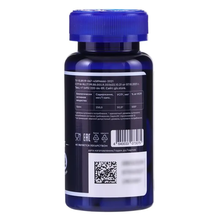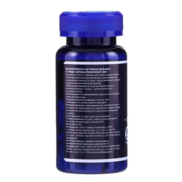Состав: хрома пиколинат - 2 мг, в том числе хрома 250 мкг, антислеживающие агенты микрокристаллическая целлюлоза, кальциевая соль стеариновой кислоты, тальк, капсула (гидроксипропилметилцеллюлоза).