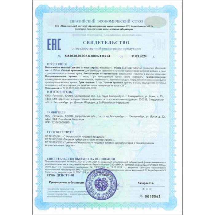 хрома пиколинат - 2 мг, в том числе хрома 250 мкг.