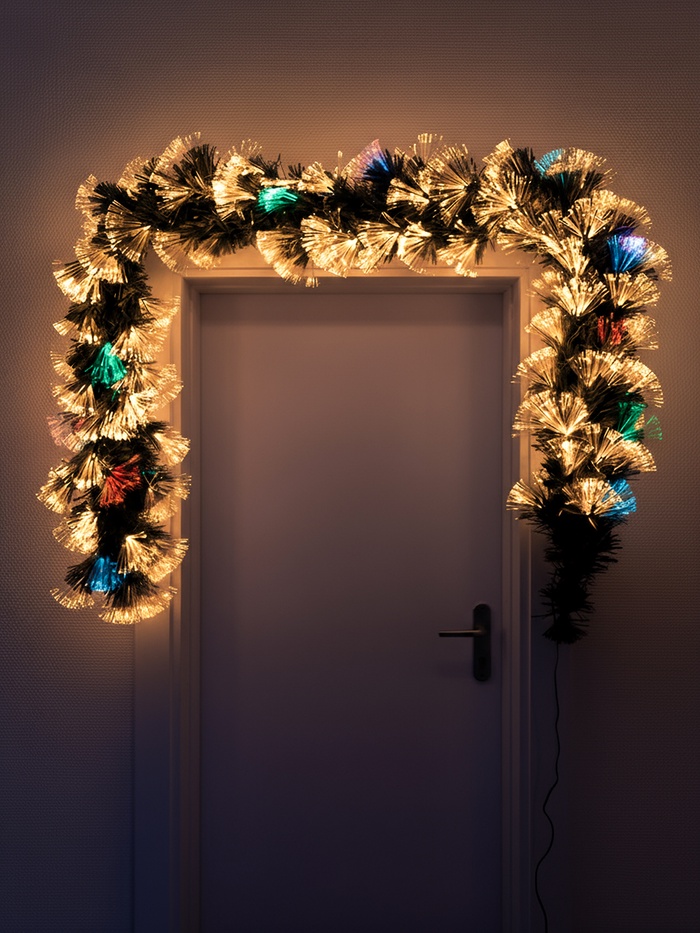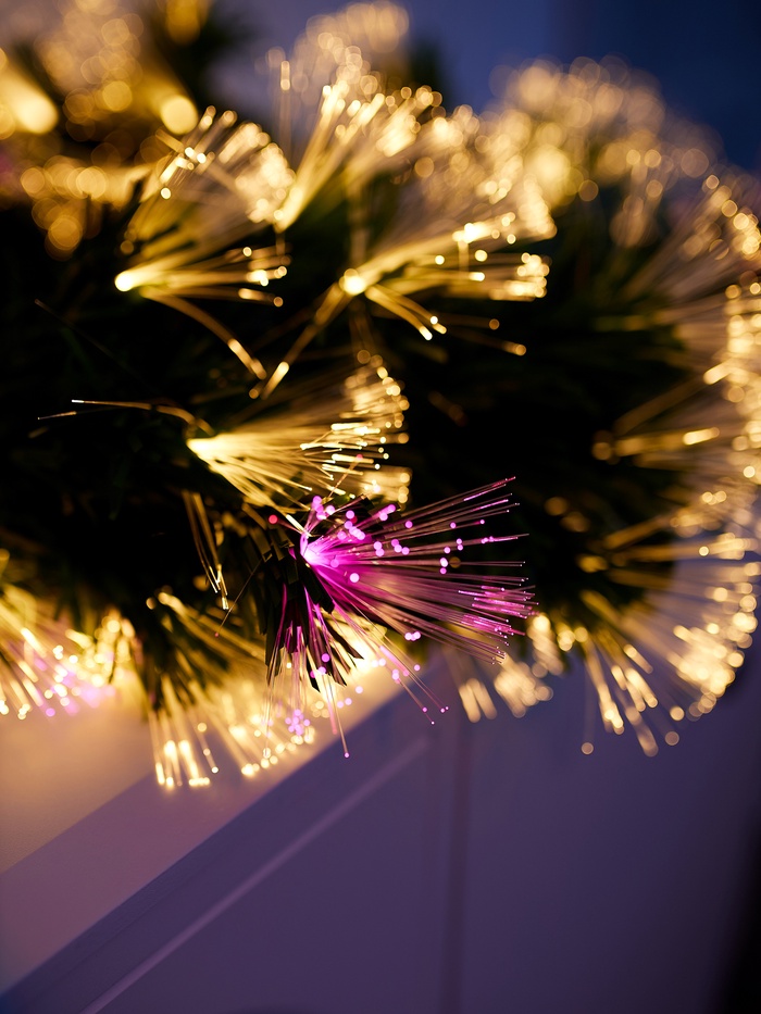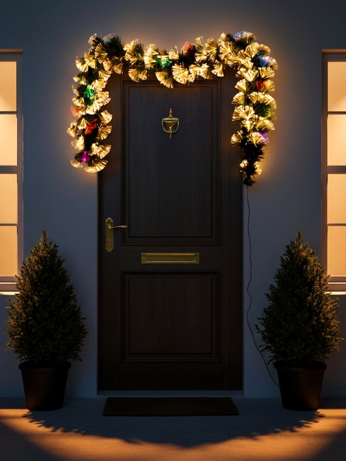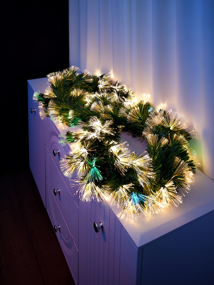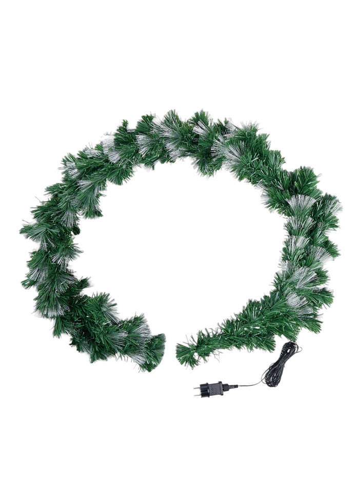 Двухметровая хвойная гирлянда с фиброоптической подсветкой оживляет интерьер тёплым белым светом. Автоматическое переключение режимов создаёт динамичное мерцание, которое привлекает взгляд и наполняет пространство праздничной атмосферой. Зелёная хвоя и жёлтые декоративные элементы гармонично сочетаются, создавая ощущение натуральной праздничной композиции.