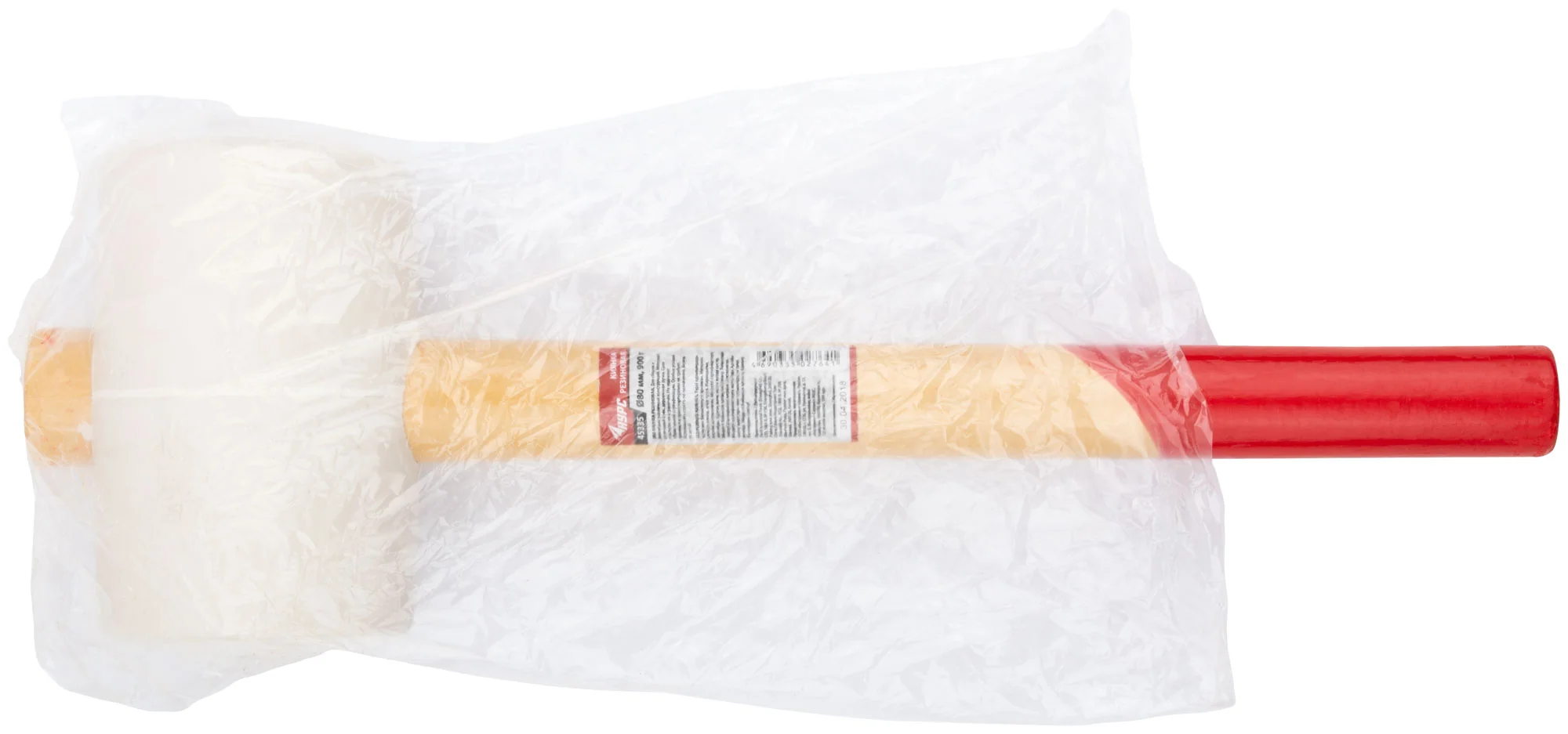 Конструкция состоит из белого резинового бойка диаметром 80 мм и деревянной ручки, обеспечивающей надежный хват. Длина инструмента 365 мм делает его удобным в использовании, а вес 900 г обеспечивает достаточную силу удара без излишнего напряжения.