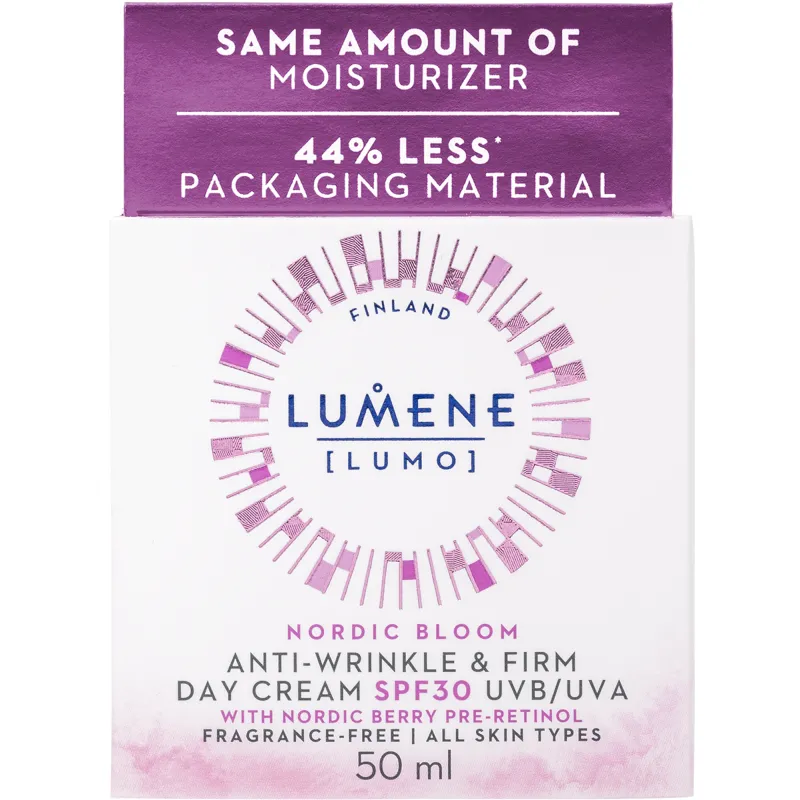 Lumene Lumo Nordic Bloom укрепляющий и разглаживающий дневной крем SPF 30 увлажняет и делает кожу более упругой, уменьшая видимость морщин. Кожа выглядит гладкой, упругой и естественно молодой. Быстро впитывающаяся формула содержит инновационный комплекс из северных ягод с преретинолом и запатентованный экстракт северной брусники, богатый кверцетином. Отлично подходит в качестве основы под макияж. Защищает кожу от UVB/UVA излучения (SPF 30).