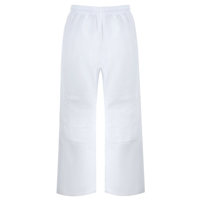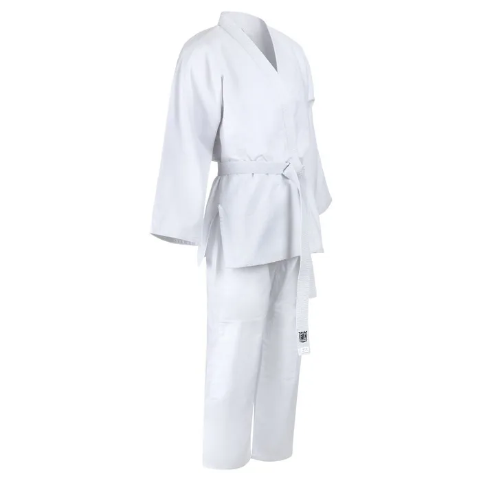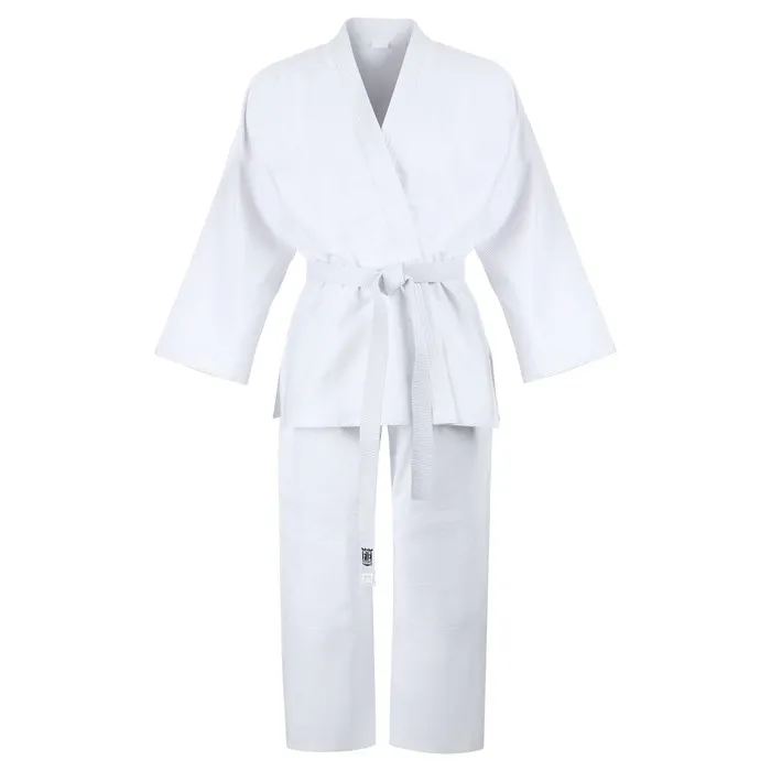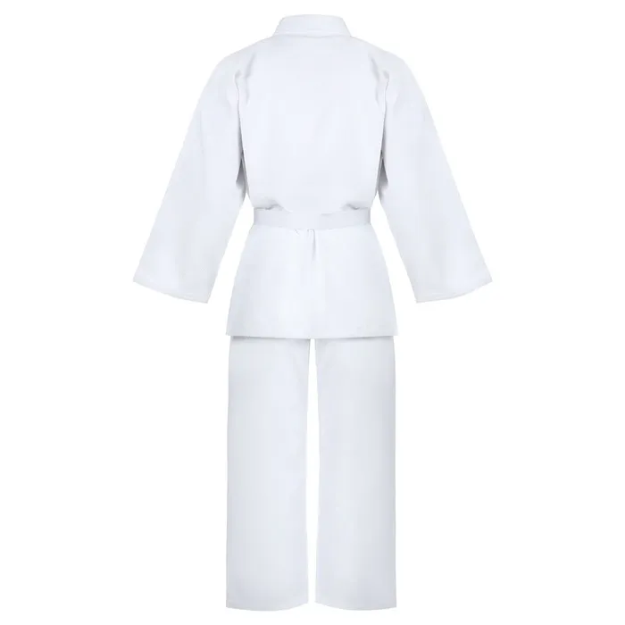 Кимоно предназначено для занятий дзюдо. Изготовлено из хлопка и полиэстера, ткань хорошо впитывает влагу и пропускает воздух. В комплект входят белый пояс, куртка и брюки с дополнительным уплотнением колен.