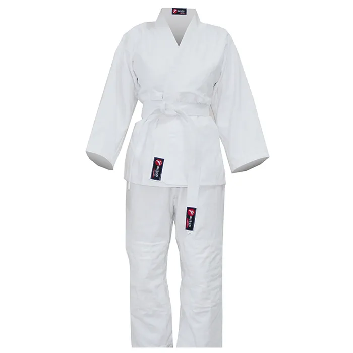 Кимоно изготовлено из 100%-го хлопка. Ткань не сковывает движений спортсмена и хорошо пропускает воздух. В комплект входят белый пояс, куртка и брюки.