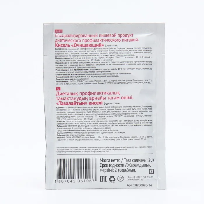 Кисель упакован в удобные порционные пакетики. Его легко взять с собой в дорогу, чтобы вкусный и полезный напиток для очищения организма был всегда под рукой.