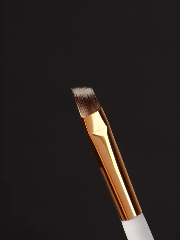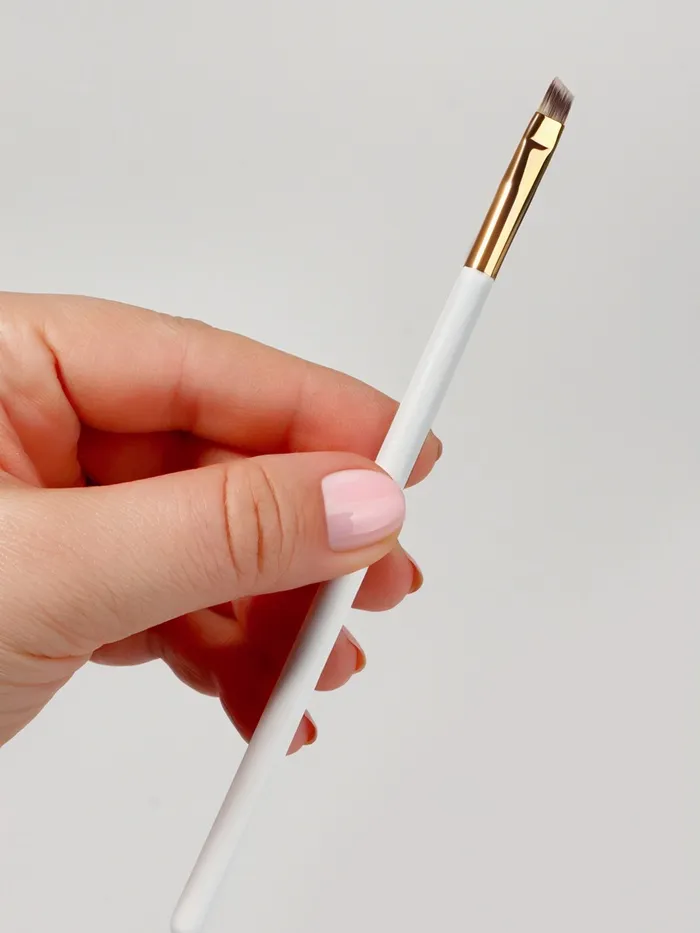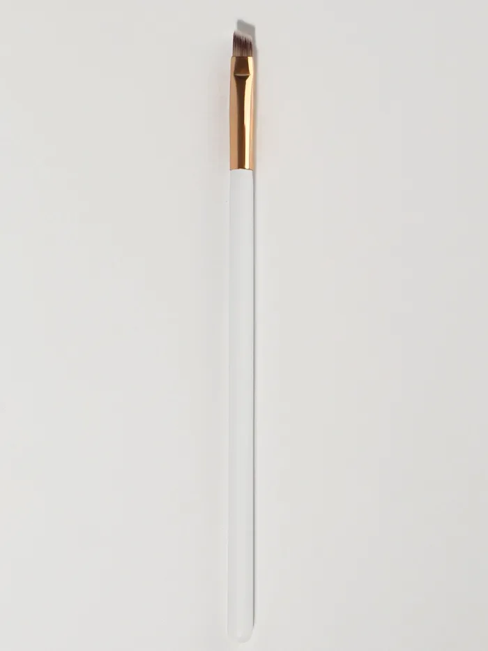 Скошенная кисть имеет плотный ворс, подойдёт для сухих, кремовых и гелевых текстур. Используйте её для нанесения теней, проработки бровей, прорисовки чётких линий. Также кисть подходит для окрашивания бровей и нанесения различных кремовых составов, может применяться при ламинировании.