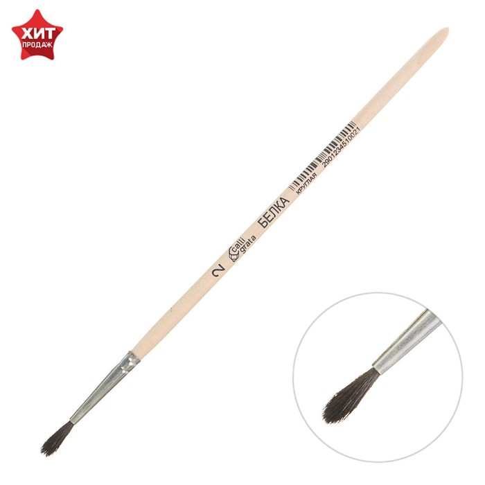Кисть для рисования, Белка круглая № 2 (диаметр обоймы 2 мм; длина волоса 12 мм), деревянная ручка, Calligrata
