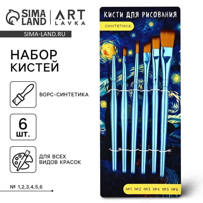 Кисть для рисования, набор синтетика плоские, 6 шт. № 1,2,3,4,5,6 «Ван Гог»