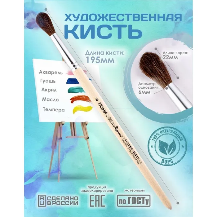 Кисти из волоса пони - это качественная альтернатива беличьим кистям. Ворс средней жёсткости, достаточно упругий и мягкий, подходит для работы с акварелью, гуашью и темперой. С помощью такой кисти легко накладывать мазки краски. Соотношение цены и качества сделало изделия из волоса пони одними из самых востребованных для детей школьного возраста. Ручка изготовлена из берёзы. Цельнометаллическая никелированная бесшовная обойма обеспечивает надёжное соединение ручки и волосяного пучка.