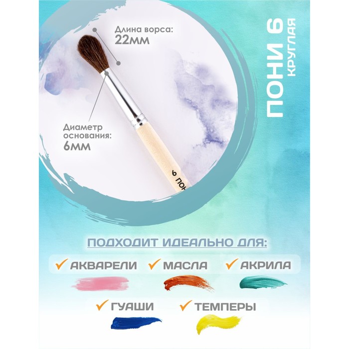 Кисть для рисования, Пони круглая № 6 (диаметр обоймы 6 мм; длина волоса 22 мм), деревянная ручка, Calligrata — Характеристики