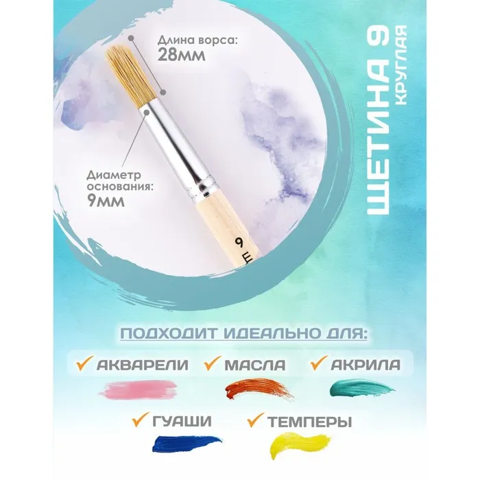 Кисть для рисования, Щетина круглая № 9 (диаметр обоймы 9 мм; длина волоса 28 мм), деревянная ручка, Calligrata — Характеристики