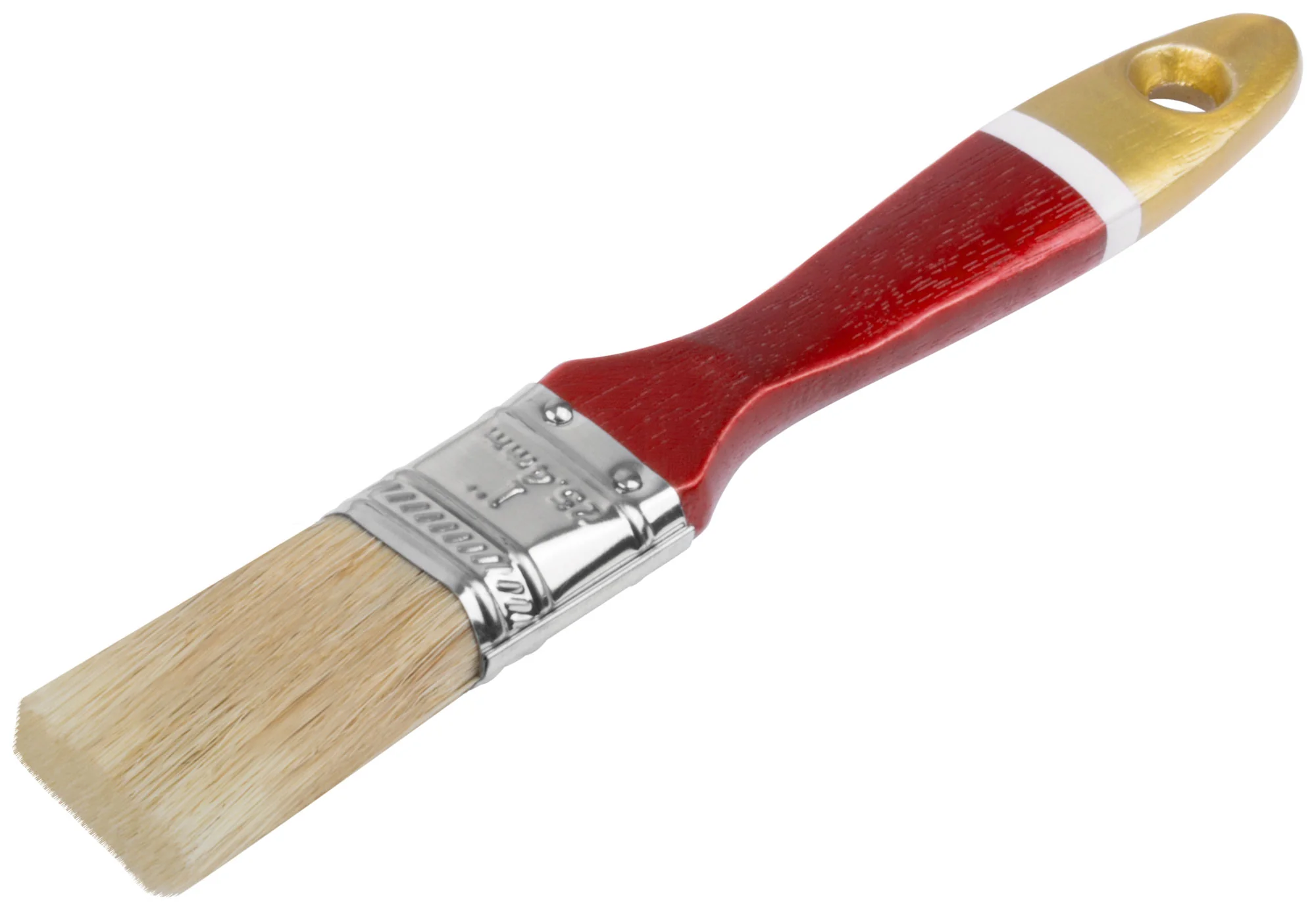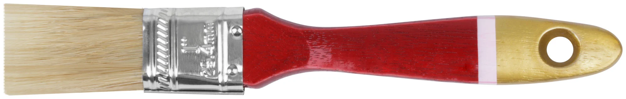 Кисть оснащена натуральной светлой щетиной, которая равномерно распределяет краску, обеспечивая качественное покрытие. Деревянная ручка гарантирует комфортный хват, позволяя работать длительное время без усталости.