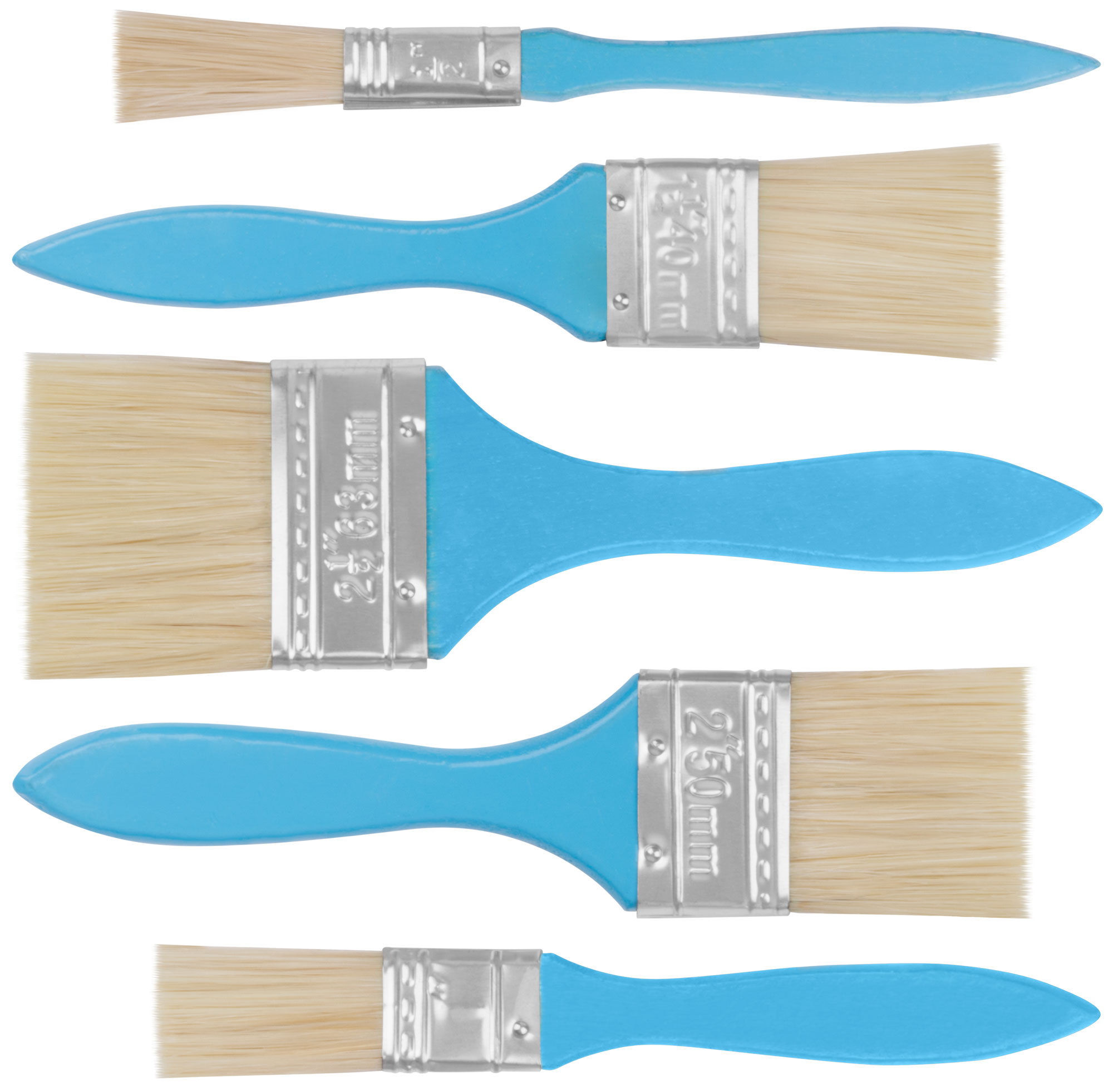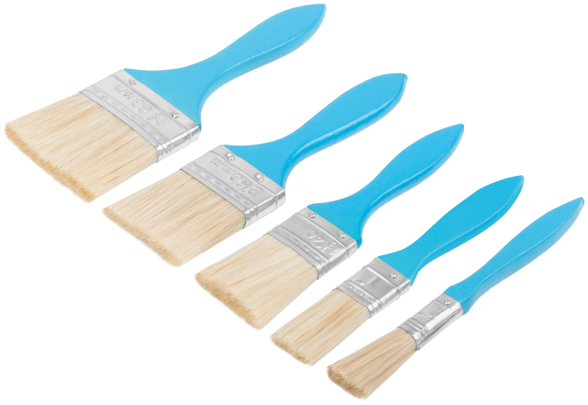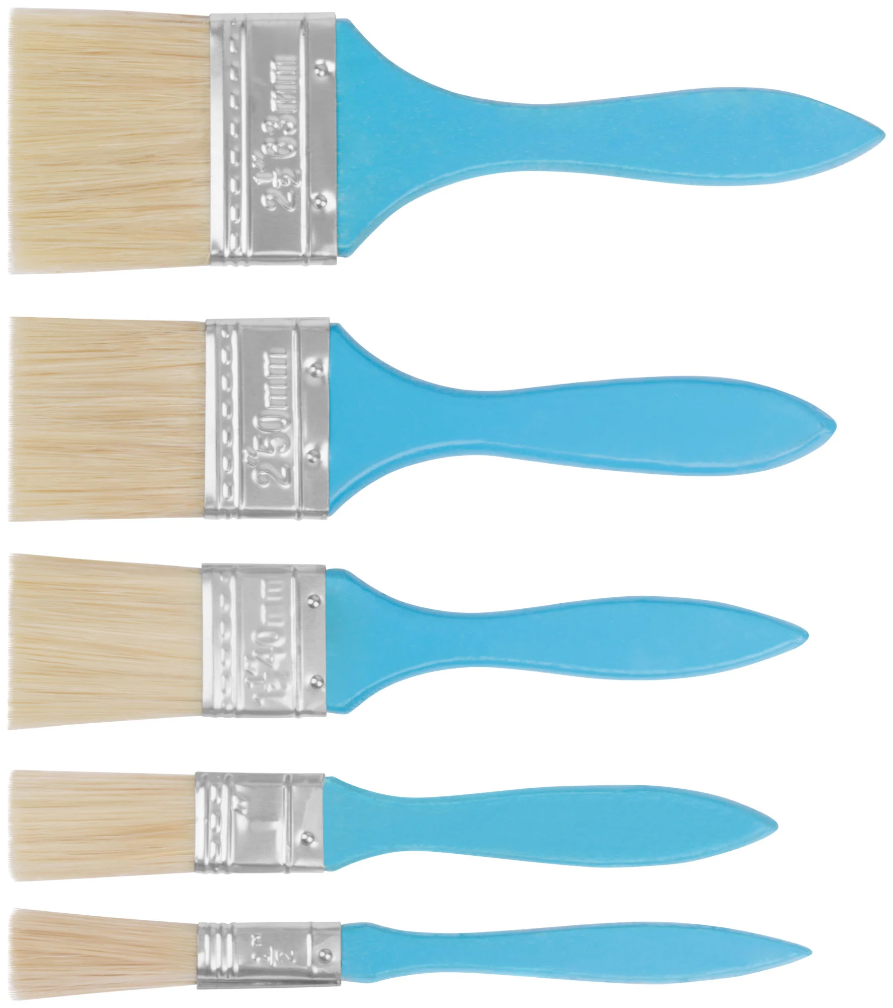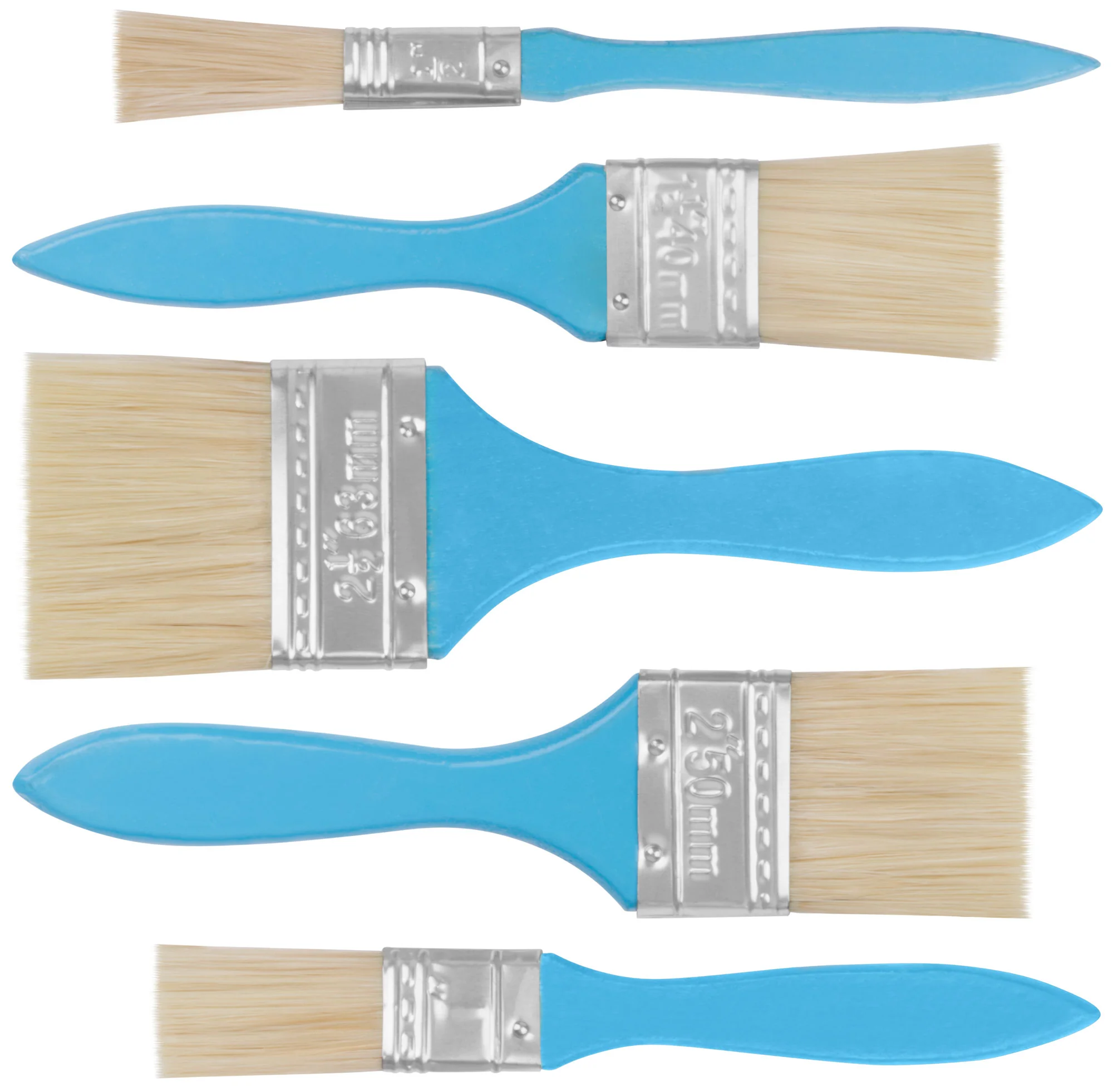 Кисти имеют натуральную светлую щетину и удобные деревянные ручки, окрашенные в синий цвет. Такой выбор материалов и конструкция обеспечивают комфортное нанесение краски, равномерное распределение и долговечность инструмента.
