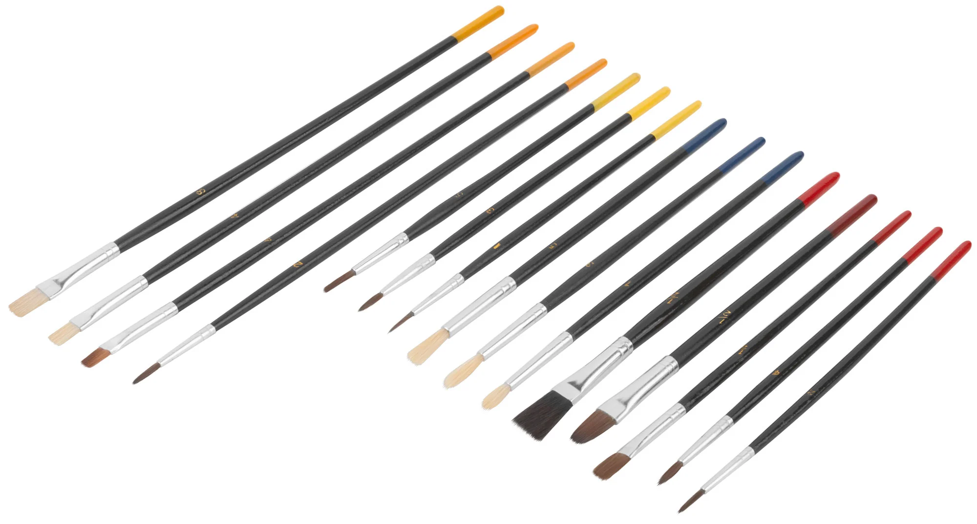 Этот набор из 15 кистей разнообразных форм и размеров станет незаменимым помощником для художников и мастеров, работающих с различными лаками и красками. Кисти идеально подходят для детальной прорисовки и нанесения фона, обеспечивая качественный результат в любом проекте.