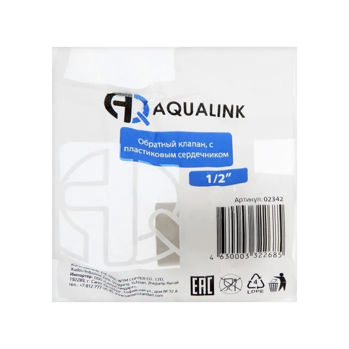 Клапан обратный AQUALINK, 1/2", внутренняя/внутренняя резьба, пластиковый сердечник — Характеристики