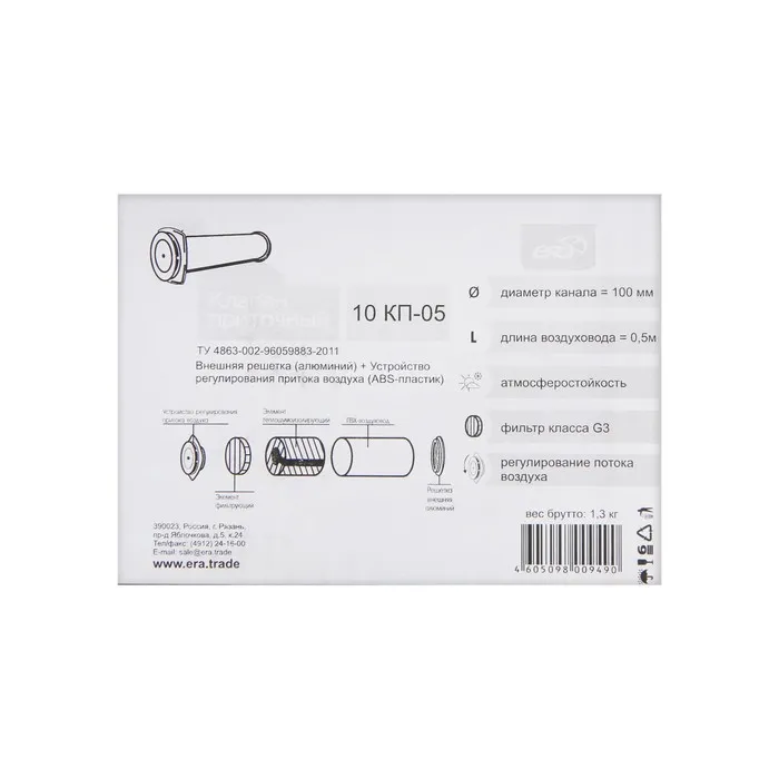 Клапан приточный ERA 10КП-05, d=100 мм, длина 500 мм, внешняя решетка из алюминия — Характеристики