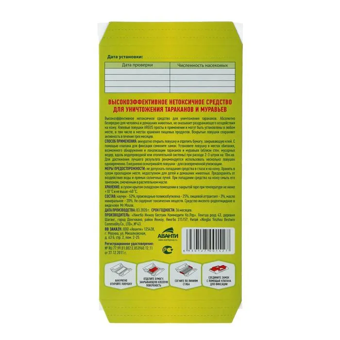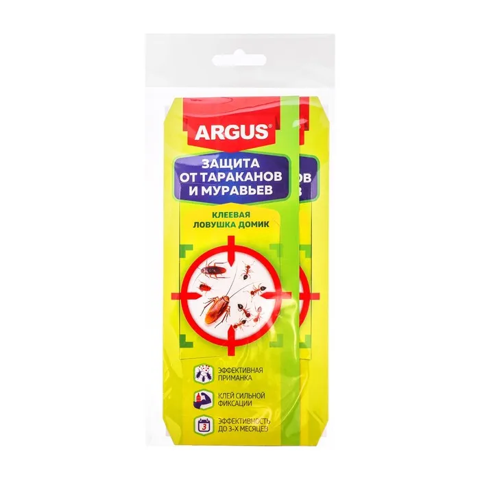 Клеевые ловушки от тараканов являются эффективным средством борьбы с этими насекомыми в домашних условиях. Одним из наиболее популярных продуктов на рынке является клеевая ловушка "ARGUS"Меры предосторожности• Перед использованием клеевой ловушки "ARGUS" необходимо ознакомиться с мерами предосторожности, чтобы избежать неприятных последствий. Во-первых, следует избегать контакта с клеем, так как он может вызвать раздражение кожи. Если вы случайно прикоснулись к клею, немедленно промойте зону контакта водой и обратитесь к врачу, если возникла реакция кожи.• Следует устанавливать ловушки в местах, недоступных для детей и домашних животных. Клеевая ловушка "ARGUS" не является ядовитым продуктом, но ее употребление может вызвать неприятные последствия для здоровья.Способ примененияОткройте упаковку и аккуратно отделите бумагу, закрывающую клей.С помощью клапана для фиксации сомкните замок.Установите ловушку вблизи стен или других мест, где вы заметили тараканов.Для достижения лучшего результата рекомендуется использовать несколько ловушек одновременно. Расположите их в разных местах комнаты.Ежедневно осматривайте ловушки, чтобы своевременно утилизировать захваченных тараканов. СОСТАВ: Каучук - 52%, производные полиизобутилена - 25%, пищевой аттрактант - 3%, масло минеральное - 20%.