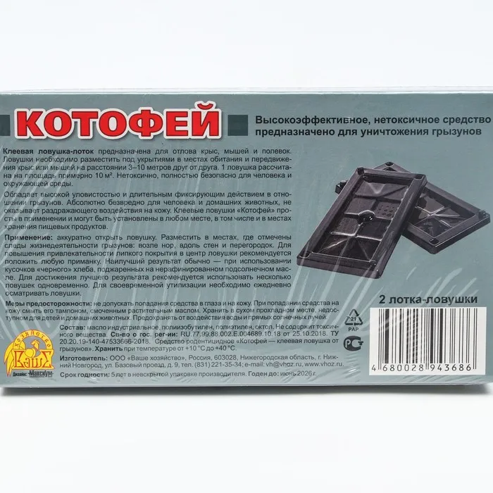 Высокоэффективное, нетоксичное средство предназначено для уничтожения мышей и мелких крыс. Обладает высокой уловистостью и длительным фиксирующим действием. Абсолютно безвредно для человека и домашних животных, не оказывает раздражающего воздействия на кожу. Клеевые ловушки «Котофей» просты в применении и могут быть установлены в любом месте, в т.ч. в местах хранения пищевых продуктов.