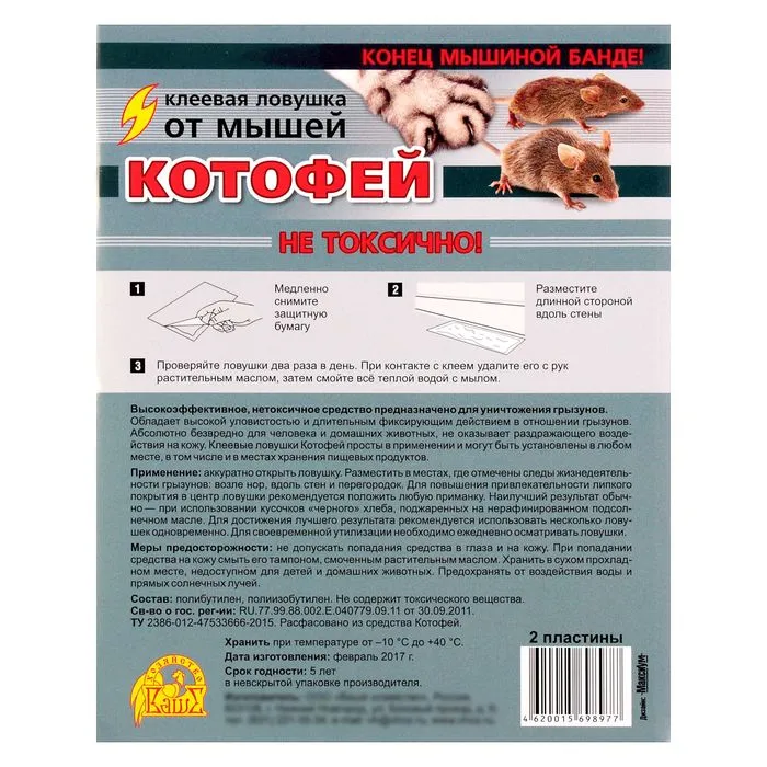 Обладает высокой уловистостью и длительным фиксирующим действием в отношении грызунов. Абсолютно безвредно для человека и домашних животных, не оказывает раздражающего воздействия на кожу. Клеевые ловушки Котофей просты в применении и могут быть установлены в любом месте, в том числе и в местах хранения пищевых продуктов.