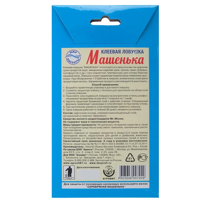 Клеевая ловушка от пищевой моли Машенька - экологически безопасное средство для отлова бабочек пищевой моли в закрытых местах хранения сухих продуктов (круп, макаронных изделий, муки, орехов, бобовых, сухофруктов) без токсичных веществ и раздражающего запаха. Клеевая ловушка может применяться как в бытовых условиях (на кухне, в кладовой), так и на продуктовых складах, в магазинах, пищеблоках. Ловушка служит надежным индикатором появления насекомых и позволяет быстро принять меры для их уничтожения.Состав: картонная основа, клеевой композиционный слой, натуральный аттрактант (феромон). Не содержит ядов и токсичных веществ.Способ применения: ловушка легко приклеивается или подвешивается на внутренней стороне шкафов, полок, стеллажей с пищевыми продуктами. Натуральный феромон в составе клеевого слоя привлекает насекомых и способствует их быстрому отлову. Ловушка работает в течение 90 дней с момента установки, надежно защищая продукты от повреждения.