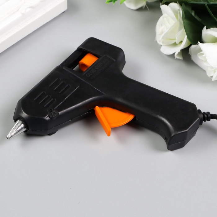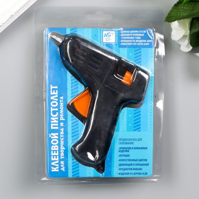 Клеевой пистолет для творчества не рассчитан на долгие работы. Подходит для приклеивания декора, маленьких деталей, склеивания бумаги. Рекомендуем держать его включённым максимум 3–5 минут, затем выключать до полного остывания. Для долгих работ лучше использовать профессиональный клеевой пистолет.