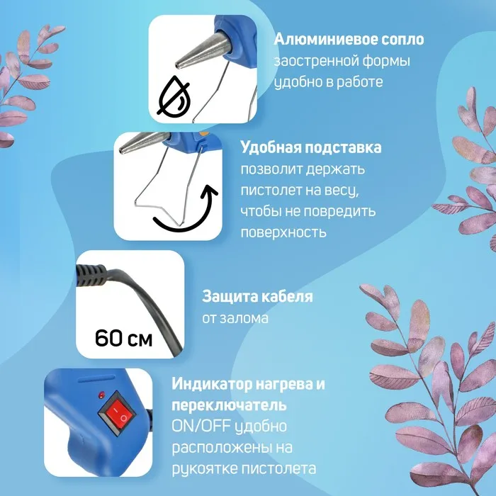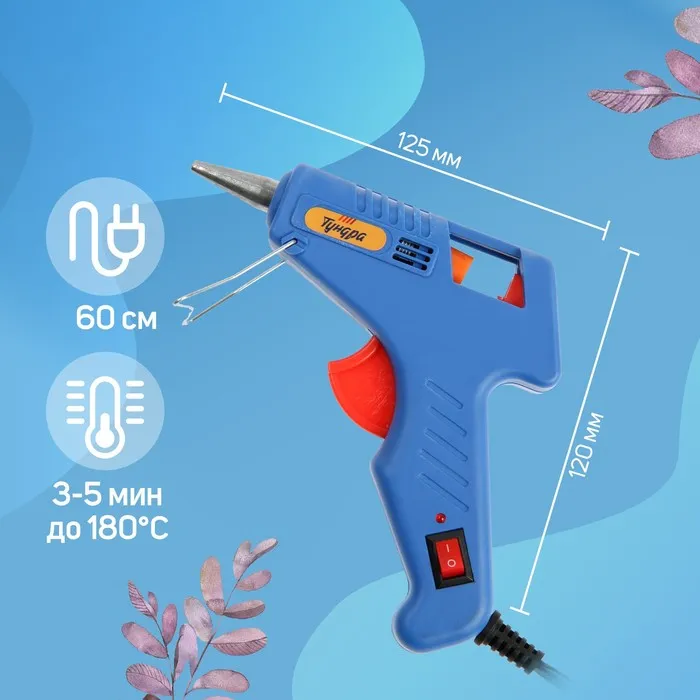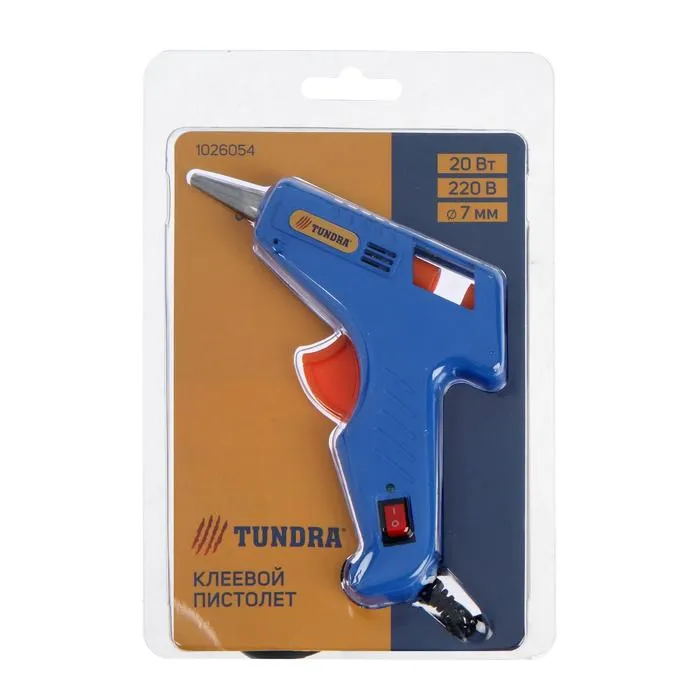 Клеевой пистолет ТУНДРА, 20 Вт, 220 В, выключатель, индикатор, длинное сопло, 7 мм — Характеристики