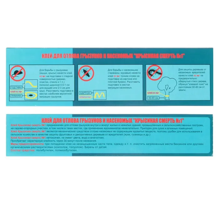 Нетоксичное клейкое средство от грызунов Клей "КРЫСИНАЯ СМЕРТЬ №1" предназначено для отлова грызунов внутри и вокруг жилых и нежилых помещений, промышленных и сельскохозяйственных построек, на садово-огородных участках, а также там, где применение ядохимикатов нежелательно. Пригоден для использования в сухих и влажных помещениях. Клей "КРЫСИНАЯ СМЕРТЬ №1"является механическим средством отлова грызунов и насекомых. Не содержит ядовитых веществ, поэтому удобен для использования в сельском и домашнем хозяйстве.